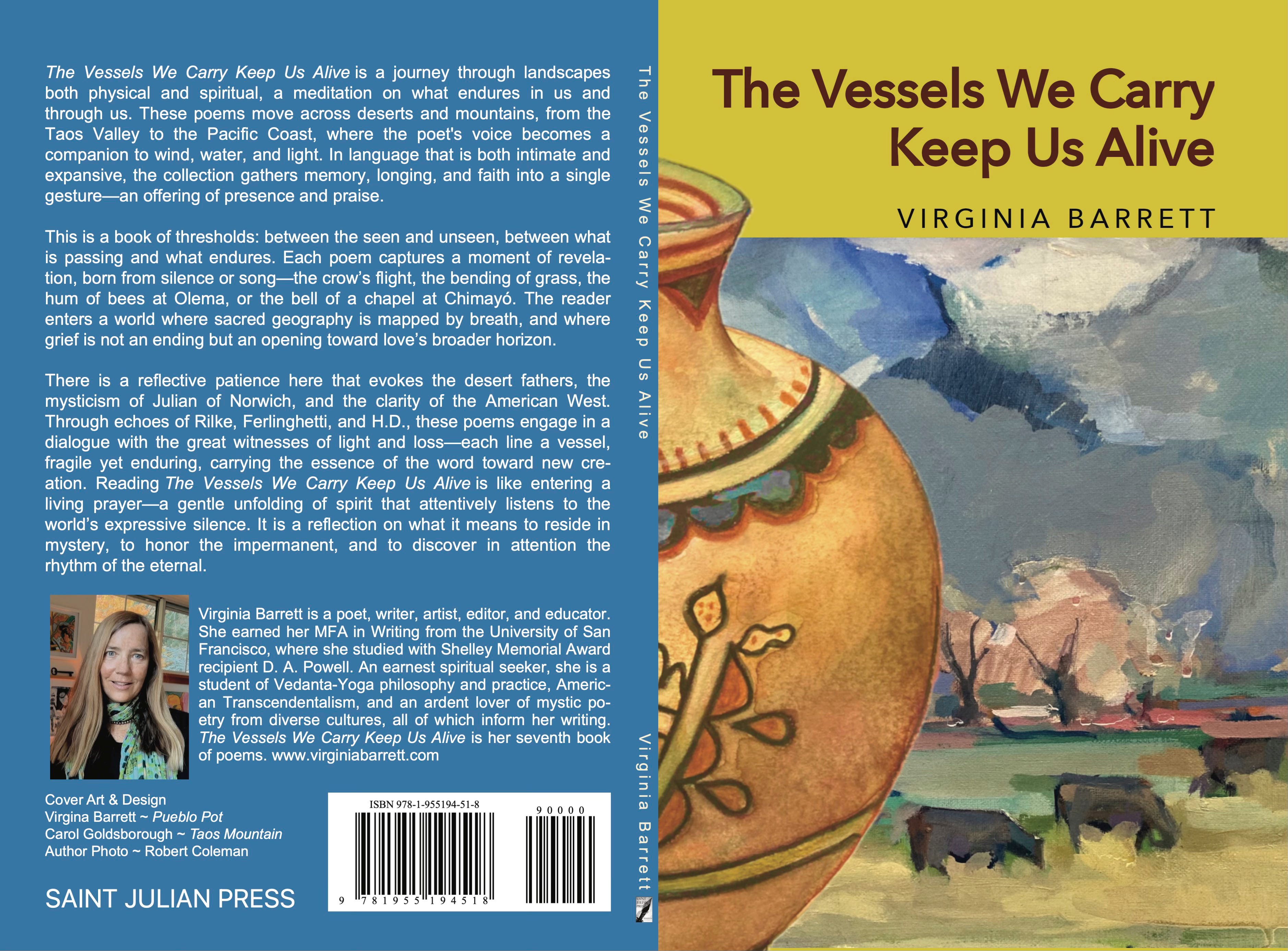 Virginia Barrett is a poet, writer, artist, editor, and educator. She earned her MFA in Writing from the University of San Francisco, where she studied with Shelley Memorial Award recipient D. A. Powell. An earnest spiritual seeker, she is a student of Vedanta-Yoga philosophy and practice, American Transcendentalism, and an ardent lover of mystic poetry from diverse cultures, all of which inform her writing. The Vessels We Carry Keep Us Alive is her seventh book of poems.